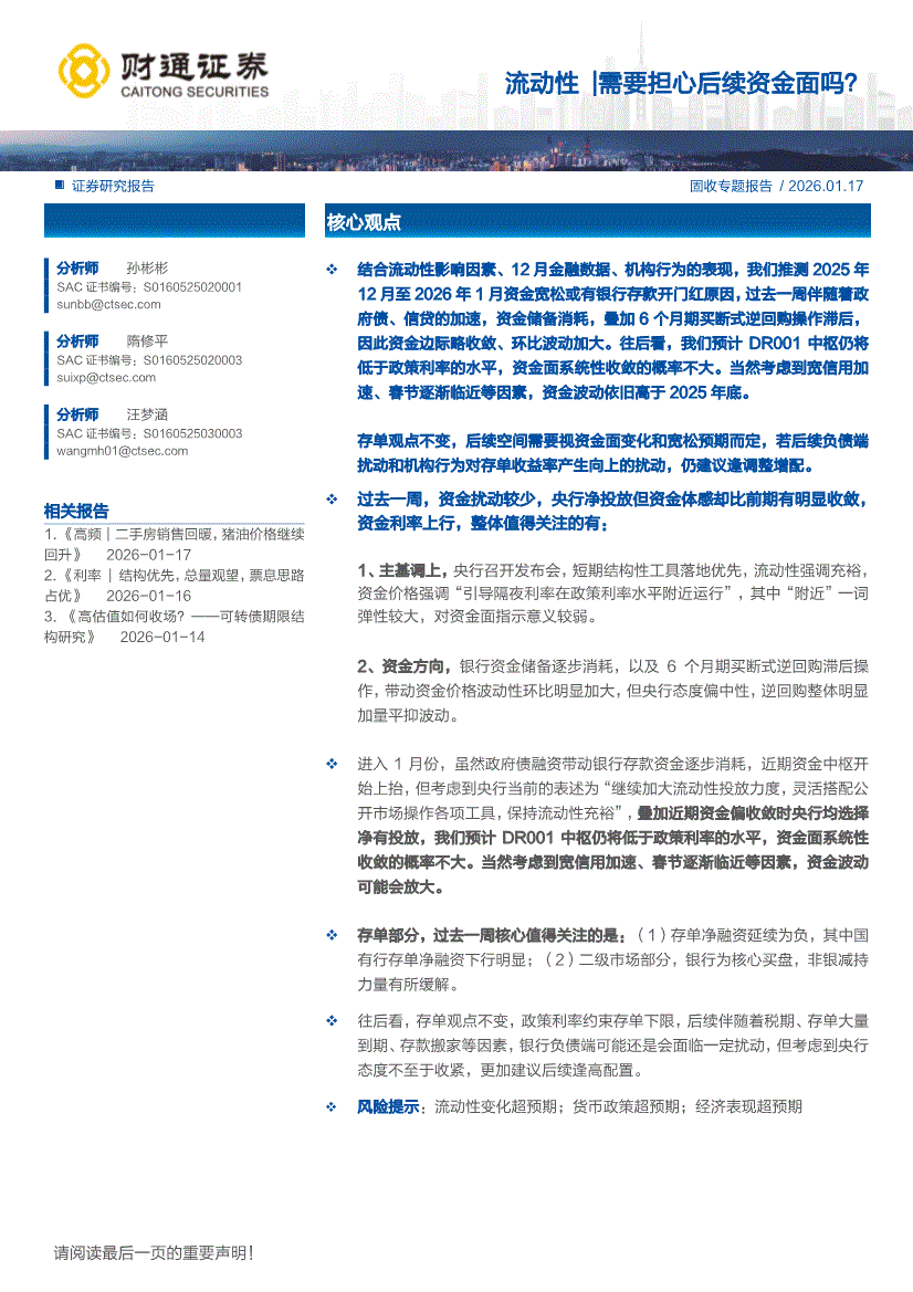 财通证券-流动性|需要担心后续资金面吗?-260117