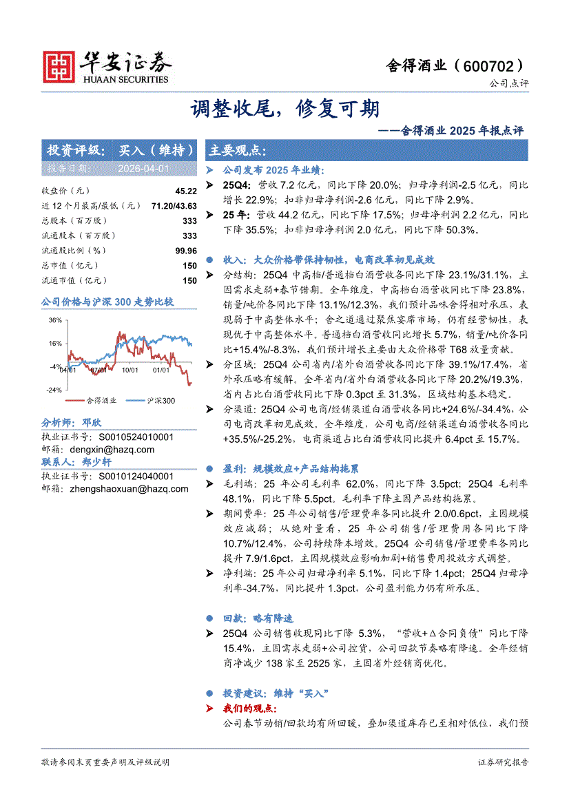 舍得酒业:华安证券-舍得酒业-600702-2025年报点评:调整收尾,修复可期-260401