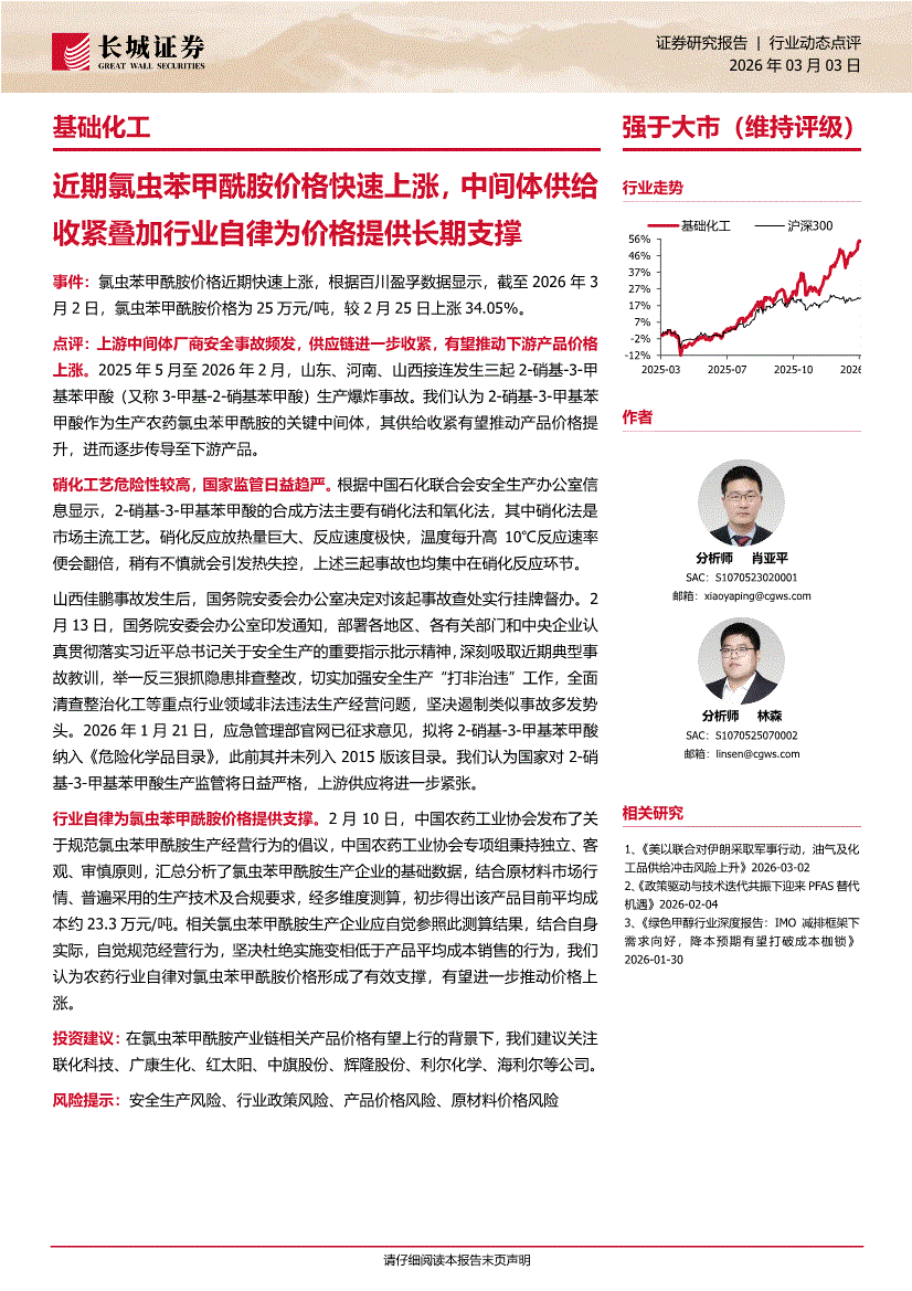 基础化工行业:长城证券-基础化工行业:近期氯虫苯甲酰胺价格快速上涨,中间体供给收紧叠加行业自律为价格提供长期支撑-260303