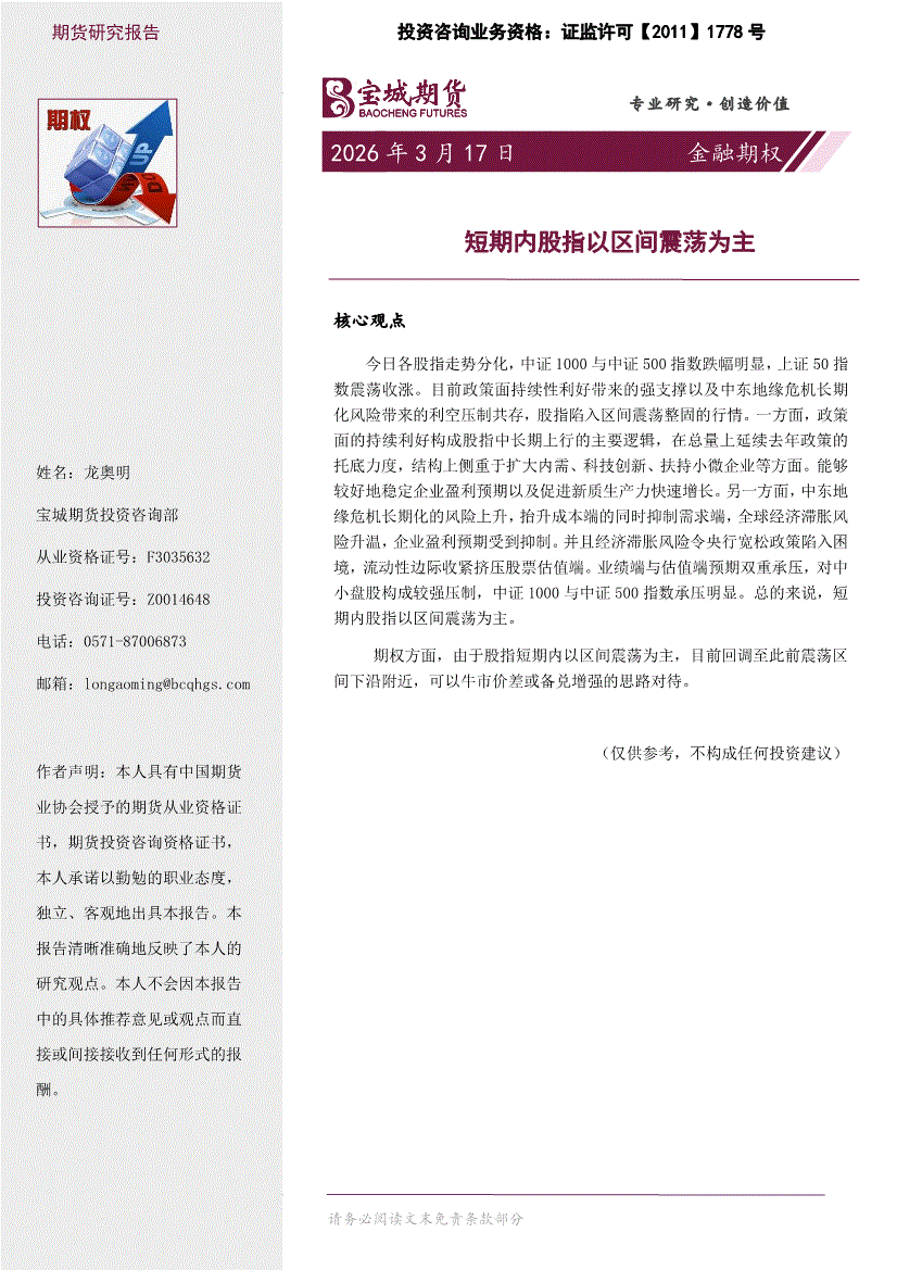 宝城期货-金融期权日报:短期内股指以区间震荡为主-260317