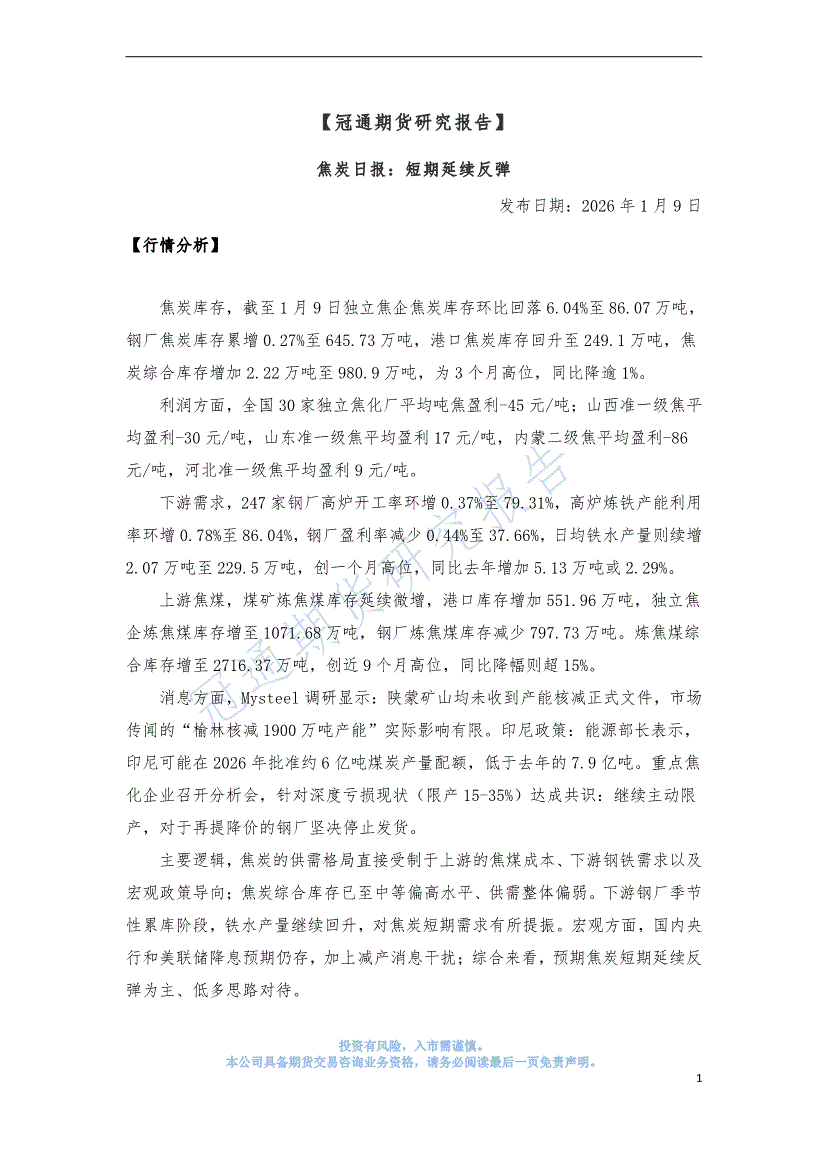 冠通期货-焦炭日报:短期延续反弹-260109