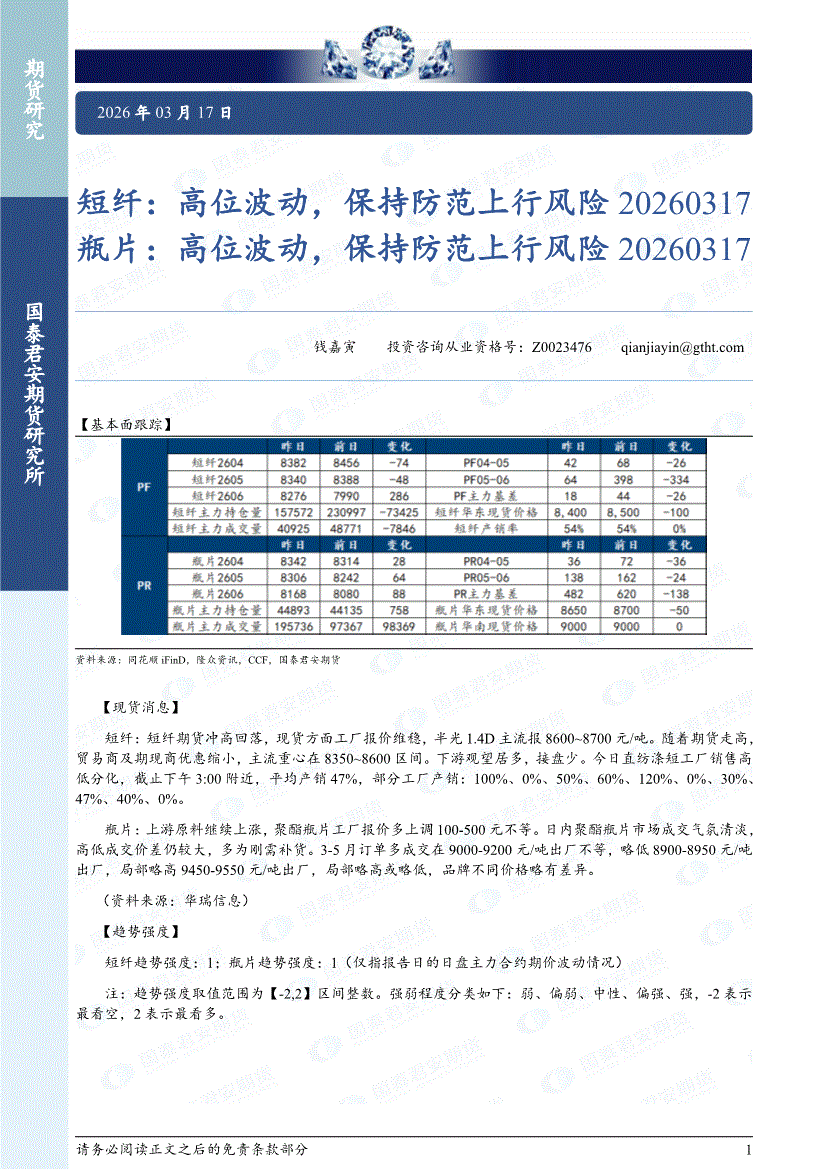 国泰君安期货-短纤:高位波动,保持防范上行风险,瓶片,高位波动,保持防范上行风险-260317