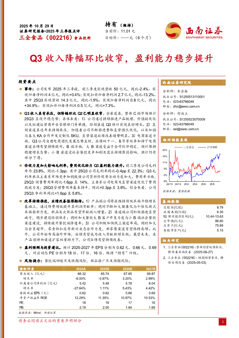 三全食品:西南证券-三全食品-002216-Q3收入降幅环比收窄,盈利能力稳步提升-251029