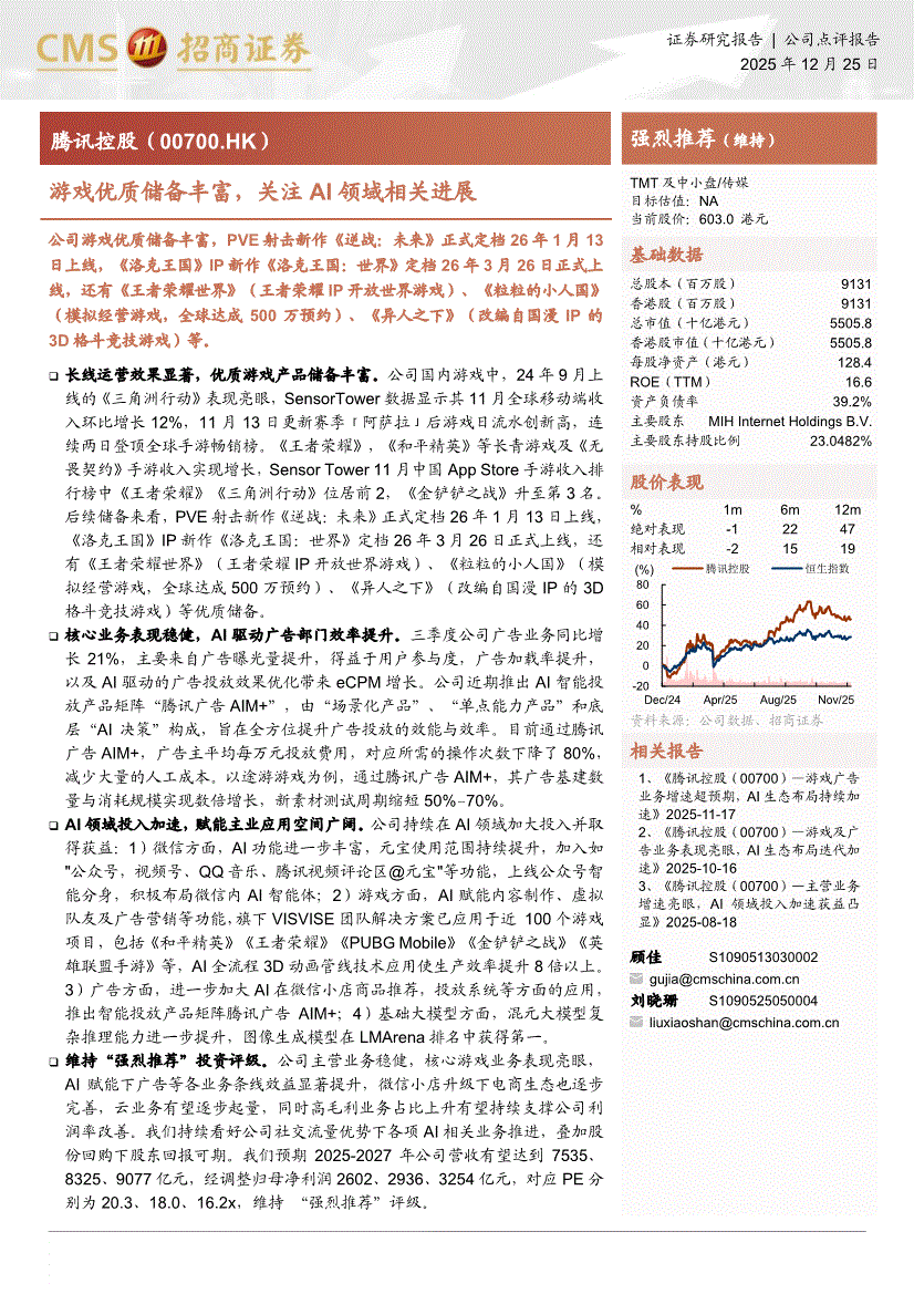 腾讯控股:招商证券-腾讯控股-0700.HK-游戏优质储备丰富,关注AI领域相关进展-251225
