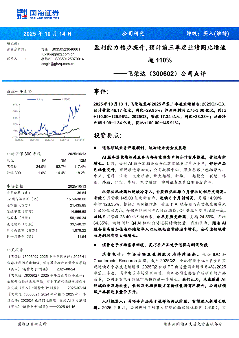 飞荣达:国海证券-飞荣达-300602-公司点评:盈利能力稳步提升,预计前三季度业绩同比增速超110%-251014