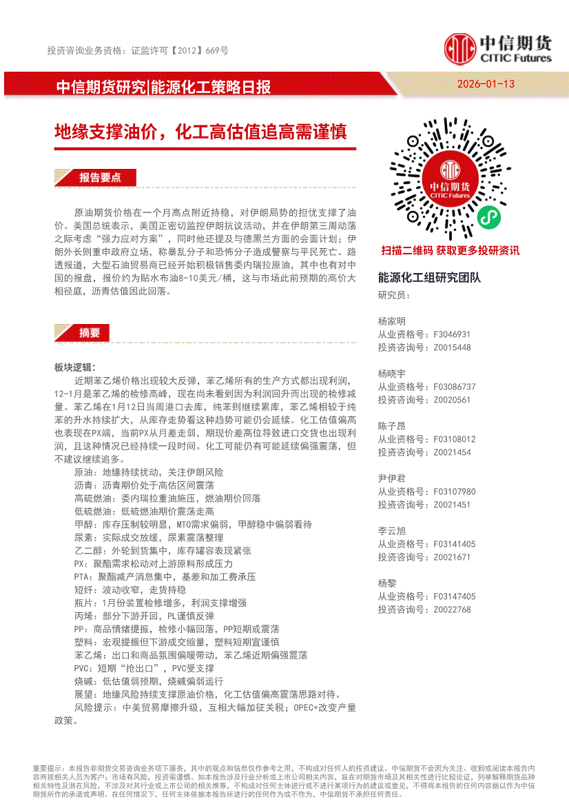 中信期货-能源化工策略日报:地缘支撑油价,化工高估值追高需谨慎-260113