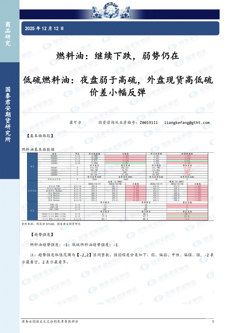 国泰君安期货-燃料油:继续下跌,弱势仍在,低硫燃料油,夜盘弱于高硫,外盘现货高低硫价差小幅反弹-251212
