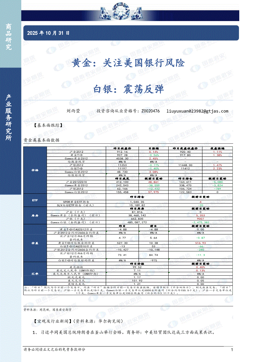 国泰君安期货-黄金:关注美国银行风险,白银,震荡反弹-251031