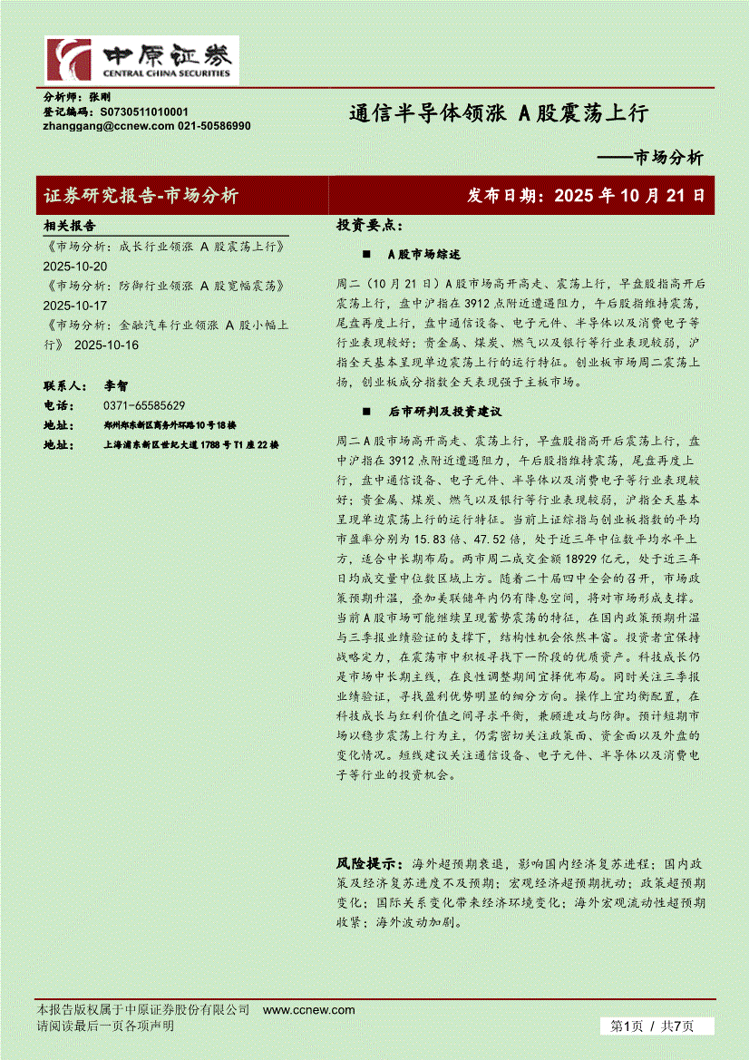 中原证券-市场分析:通信半导体领涨,A股震荡上行-251021