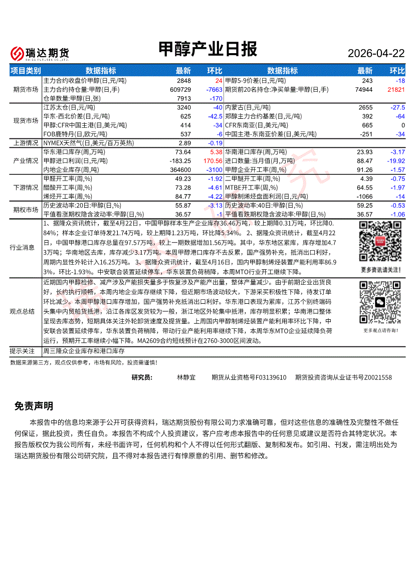 瑞达期货-甲醇产业日报-260422