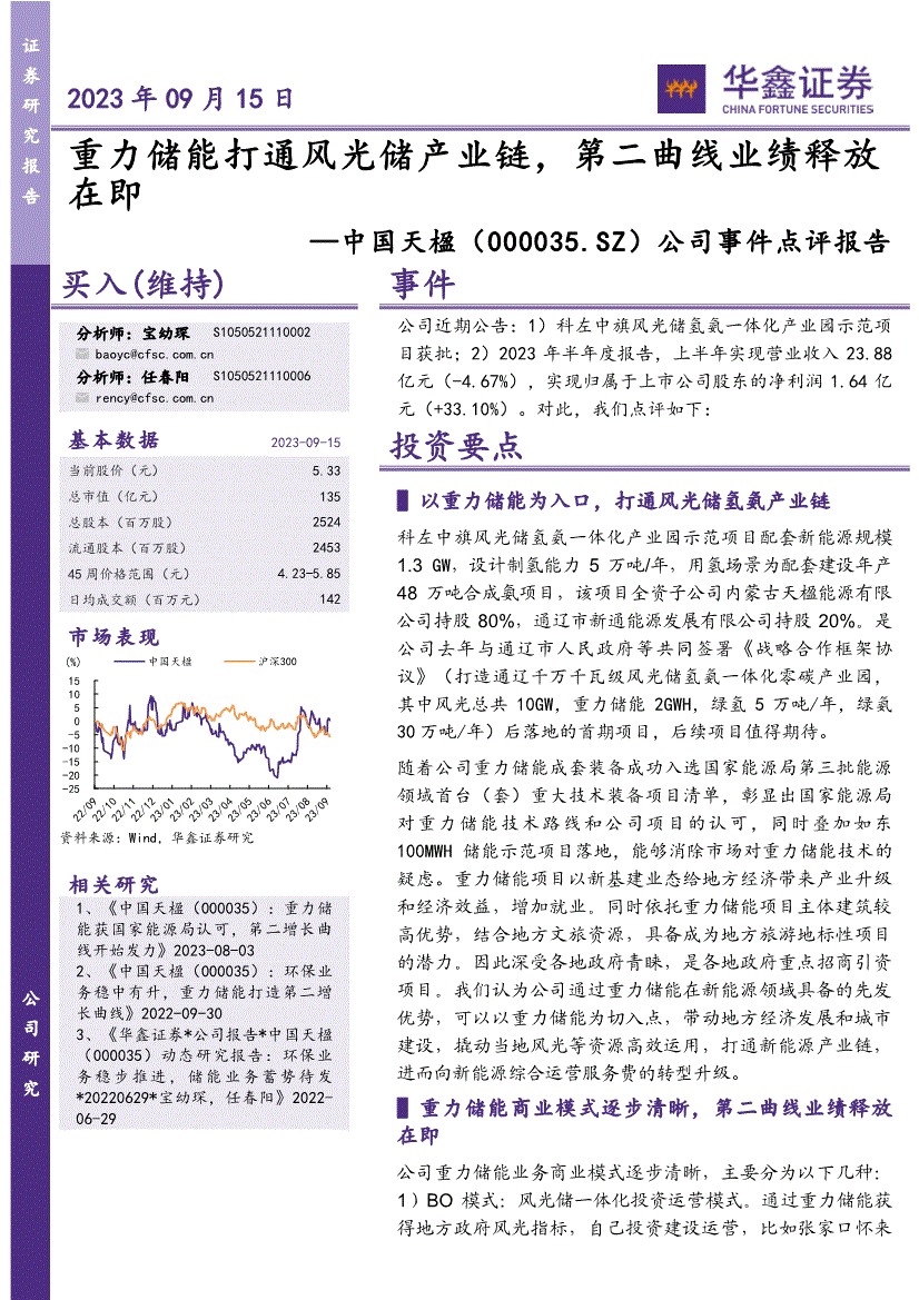 中国天楹:华鑫证券-中国天楹-000035-公司事件点评报告:重力储能打通风光储产业链,第二曲线业绩释放在即-230915