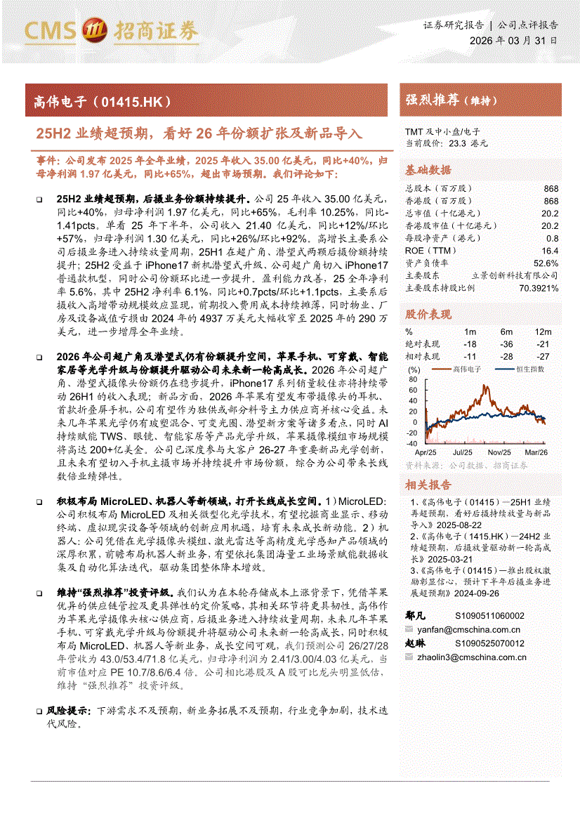 高伟电子:招商证券-高伟电子-1415.HK-25H2业绩超预期,看好26年份额扩张及新品导入-260331