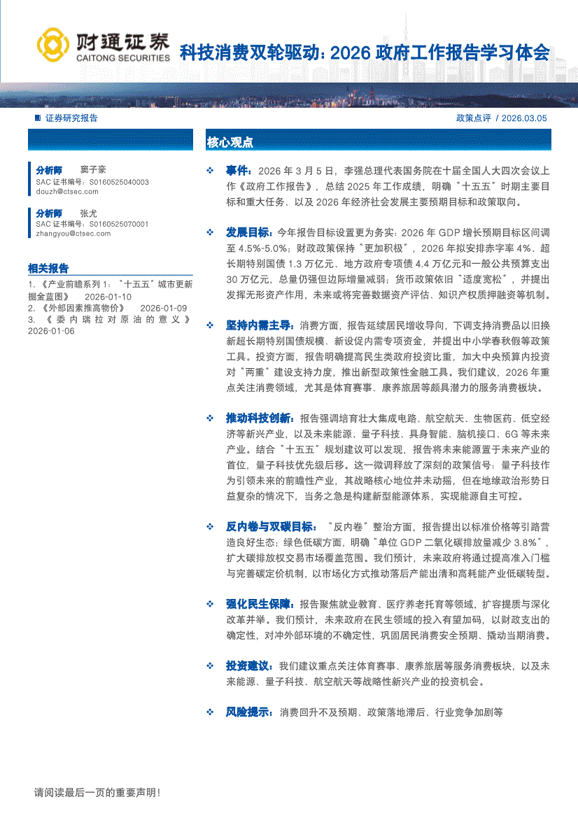 财通证券-政策点评:科技消费双轮驱动,2026政府工作报告学习体会-260305
