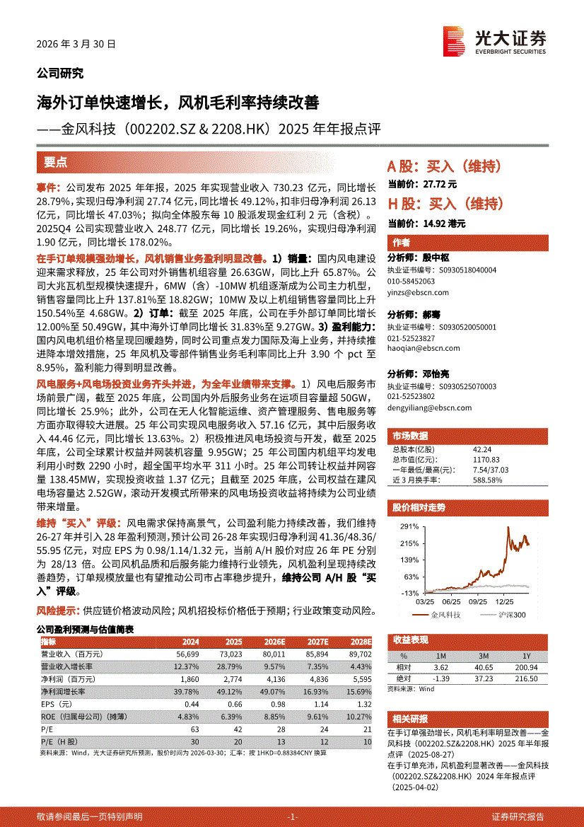 金风科技:光大证券-金风科技-002202-2025年年报点评:海外订单快速增长,风机毛利率持续改善-260330