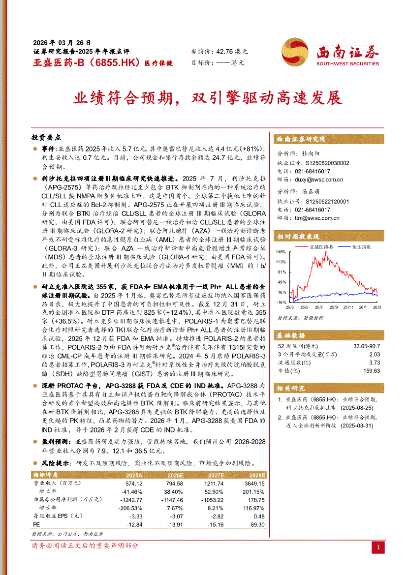 亚盛医药~B:西南证券-亚盛医药~B-6855.HK-2025年年报点评:业绩符合预期,双引擎驱动高速发展-260326