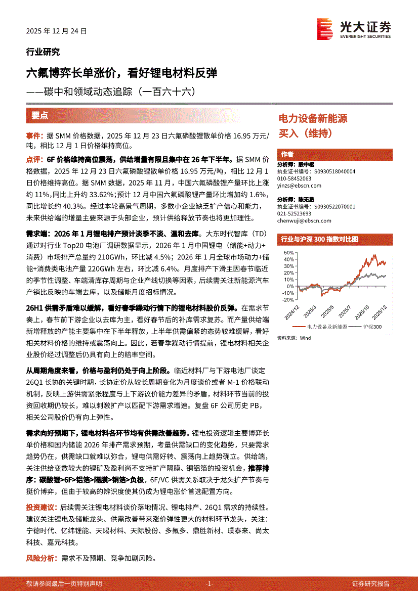 电力设备新能源行业:光大证券-电力设备新能源行业碳中和领域动态追踪(一百六十六):六氟博弈长单涨价,看好锂电材料反弹-251224