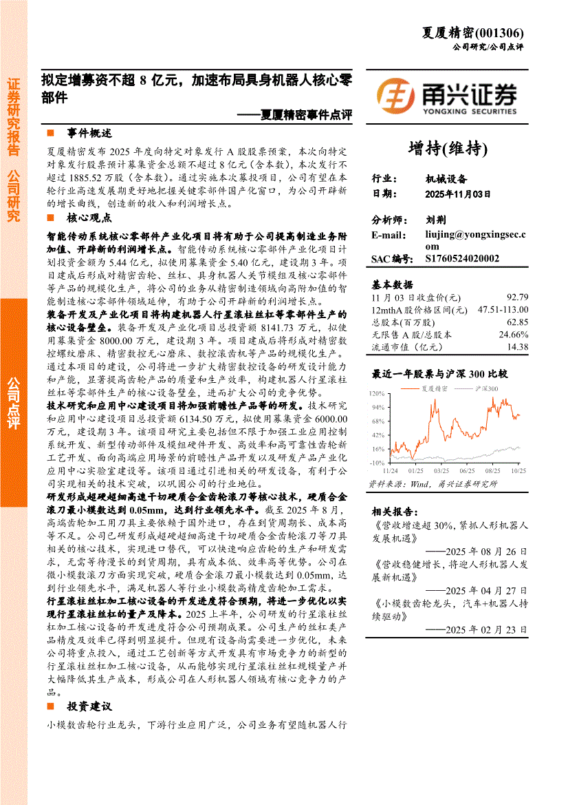 夏厦精密:甬兴证券-夏厦精密-001306-事件点评:拟定增募资不超8亿元,加速布局具身机器人核心零部件-251103