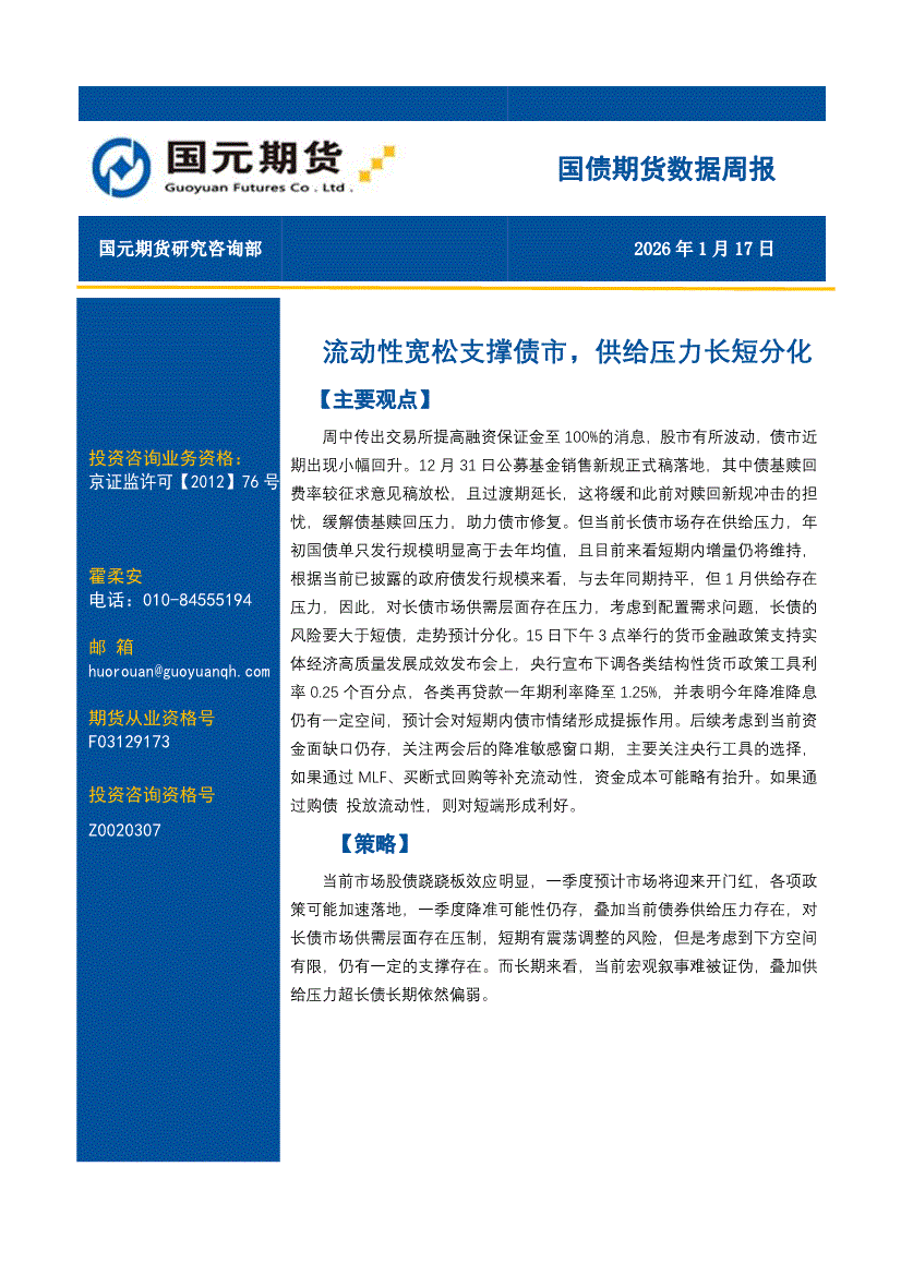 国元期货-国债期货数据周报:流动性宽松支撑债市,供给压力长短分化-260117