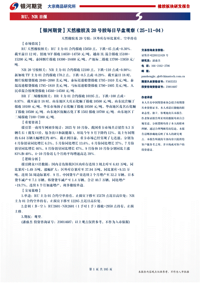 银河期货-天然橡胶及20号胶每日早盘观察-251031