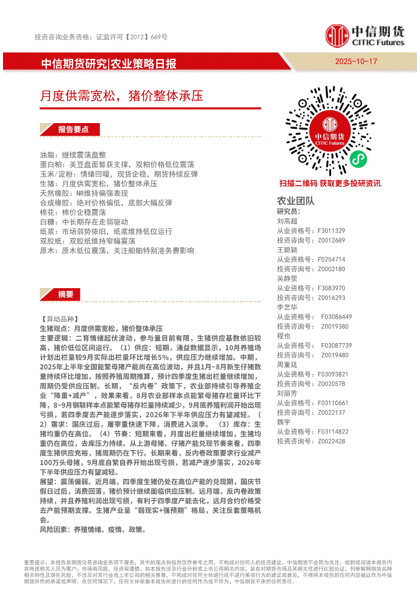 中信期货-农业策略日报:月度供需宽松,猪价整体承压-251017