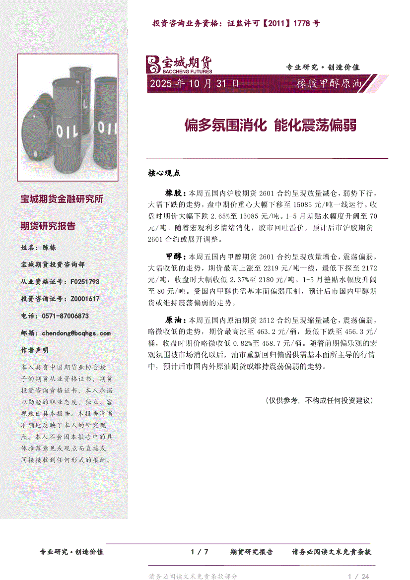 宝城期货-橡胶甲醇原油日报:偏多氛围消化,能化震荡偏弱-251031