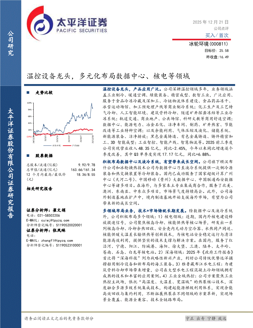 冰轮环境:太平洋证券-冰轮环境-000811-温控设备龙头,多元化布局数据中心、核电等领域-251221