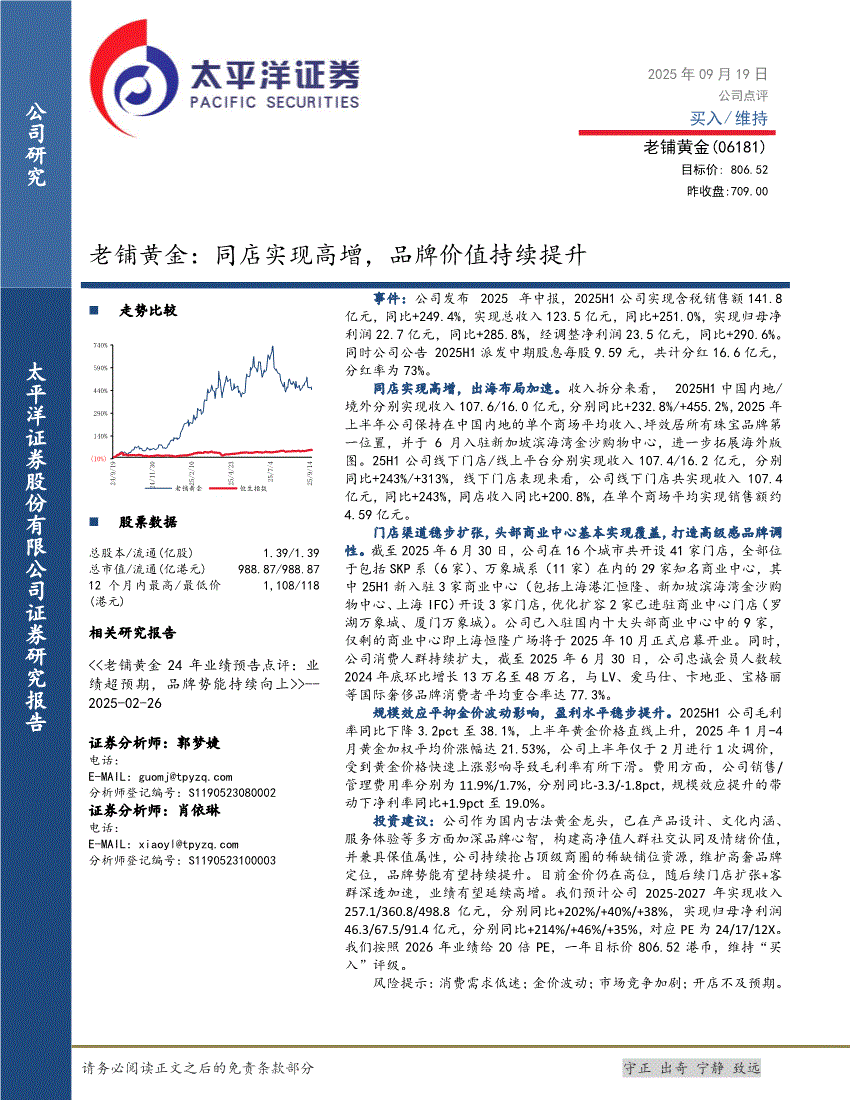 老铺黄金:太平洋证券-老铺黄金-6181.HK-同店实现高增,品牌价值持续提升-250919