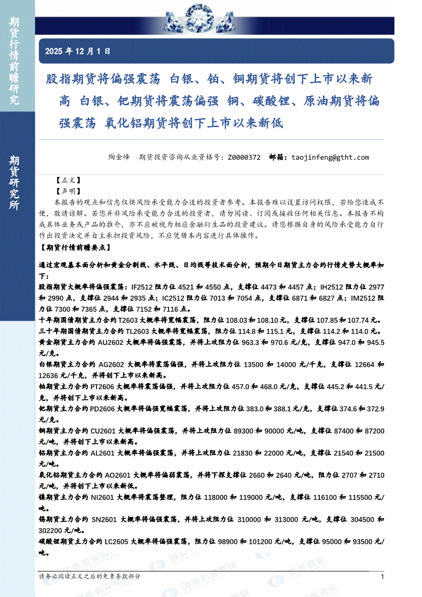 国泰君安期货-股指期货将偏强震荡,白银、铂、铜期货将创下上市以来新高,白银、钯期货将震荡偏强,铜、碳酸锂、原油期货将偏强震荡,氧化铝期货将创下上市以来新低-251201