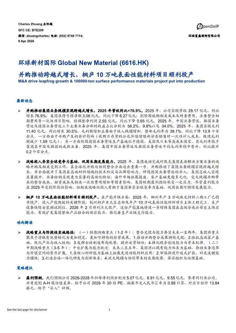 环球新材国际:环球富盛-环球新材国际-6616.HK-并购推动跨越式增长,桐庐10万吨表面性能材料项目顺利投产-260409