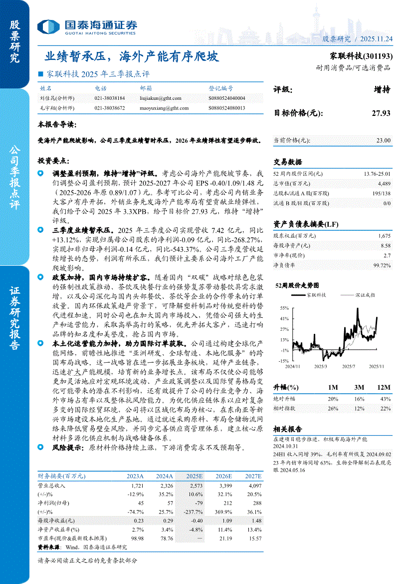 家联科技:国泰海通证券-家联科技-301193-2025年三季报点评:业绩暂承压,海外产能有序爬坡-251124