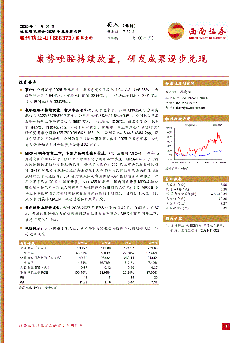 盟科药业:西南证券-盟科药业-688373-康替唑胺持续放量,研发成果逐步兑现-251101