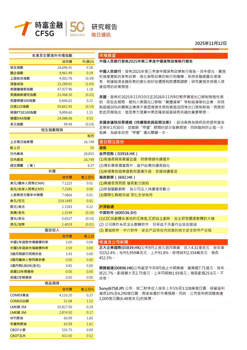 光大证券(国际)-大行晨报:政府停摆结束或利淡美元-251112