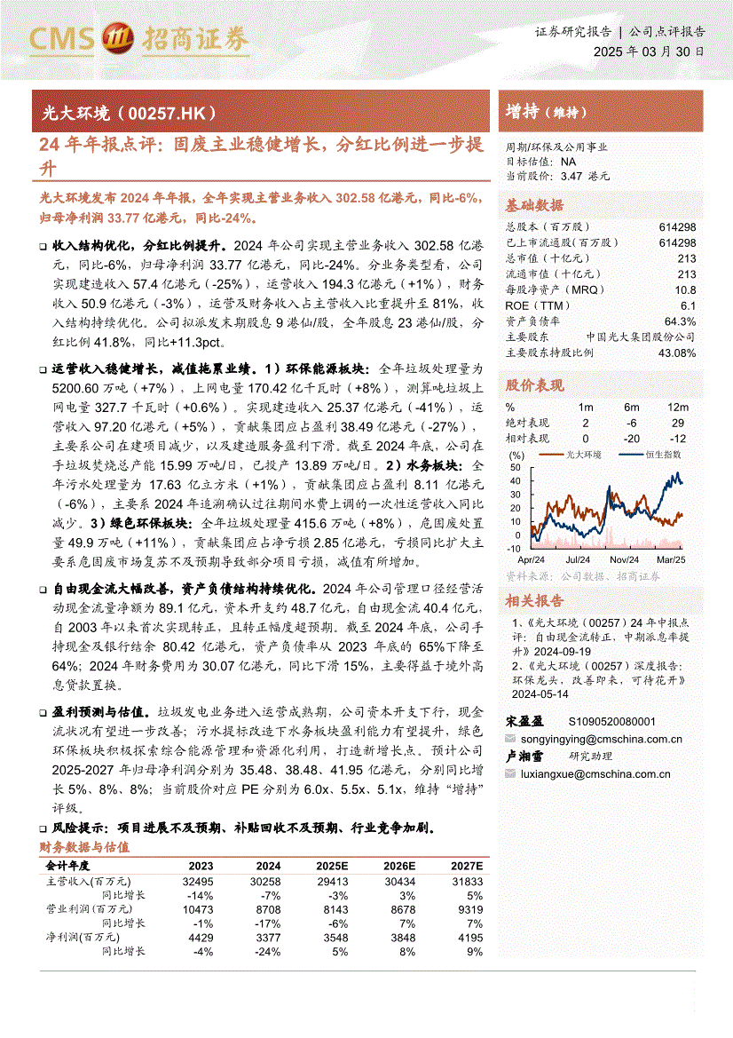 光大环境:招商证券-光大环境-0257.HK-24年年报点评:固废主业稳健增长,分红比例进一步提升-250330