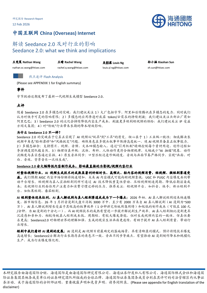互联网行业:海通国际-中国互联网行业:解读Seedance2.0及对行业的影响-260212