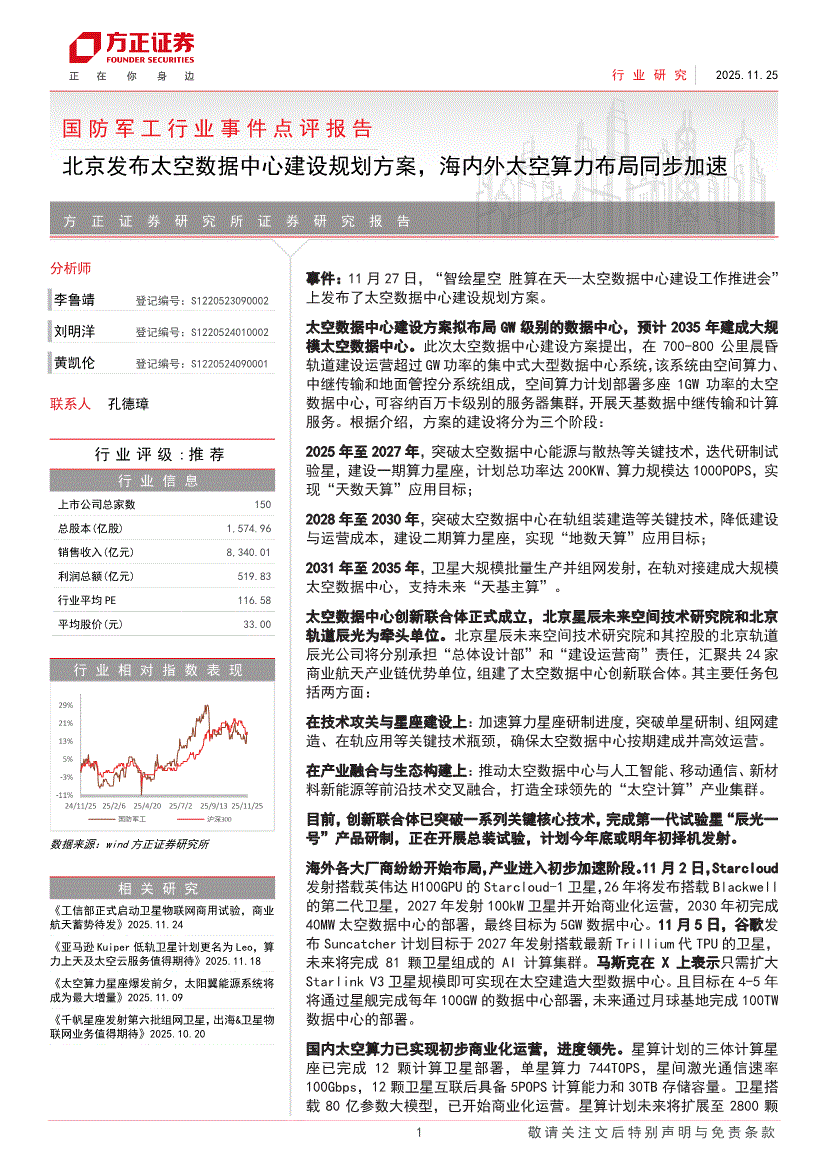 国防军工行业:方正证券-国防军工行业事件点评报告:北京发布太空数据中心建设规划方案,海内外太空算力布局同步加速-251125
