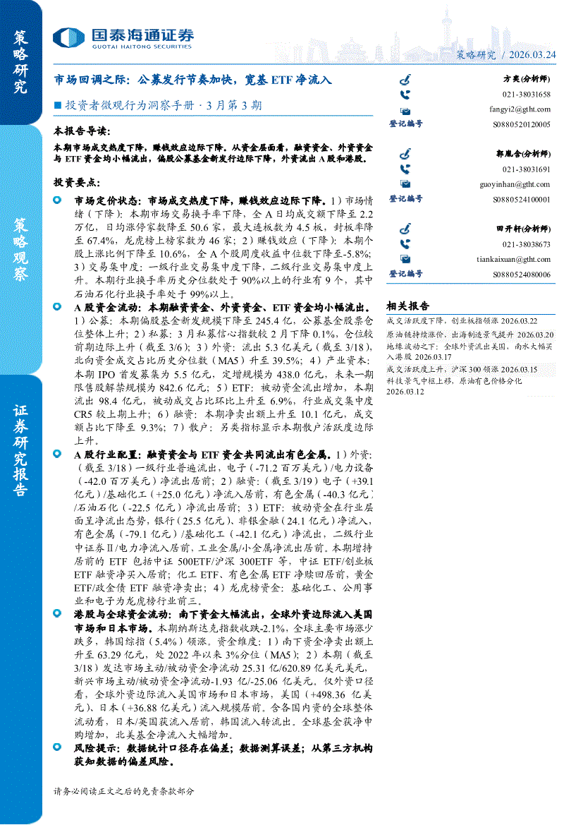 国泰海通证券-投资者微观行为洞察手册·3月第3期:市场回调之际,公募发行节奏加快,宽基ETF净流入-260324