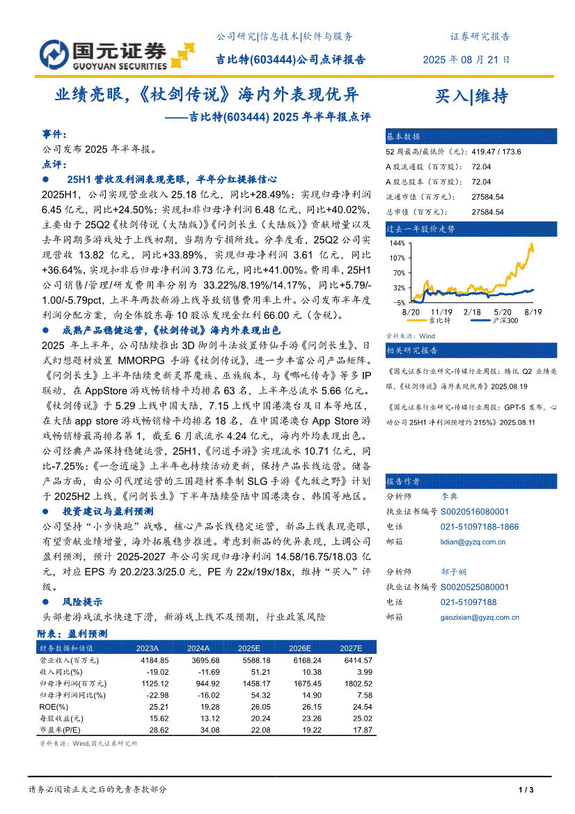 吉比特:国元证券-吉比特-603444-2025年半年报点评:业绩亮眼,《杖剑传说》海内外表现优异-250821