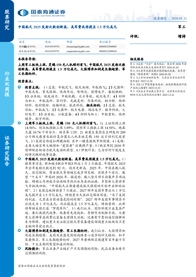 军工行业:国泰海通证券-军工行业:中国航天2025发射次数创新高,美军费或将提至1.5万亿美元-260111
