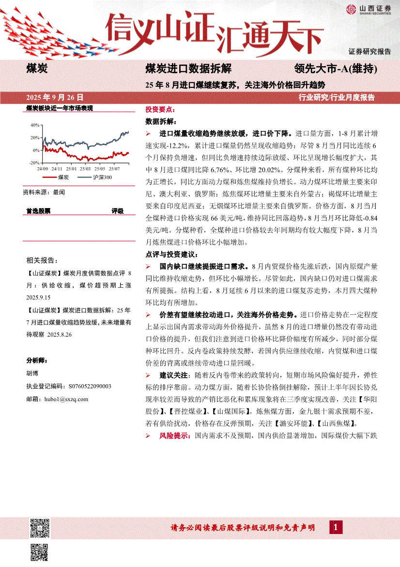 煤炭行业:山西证券-煤炭行业进口数据拆解:25年8月进口煤继续复苏,关注海外价格回升趋势-250926