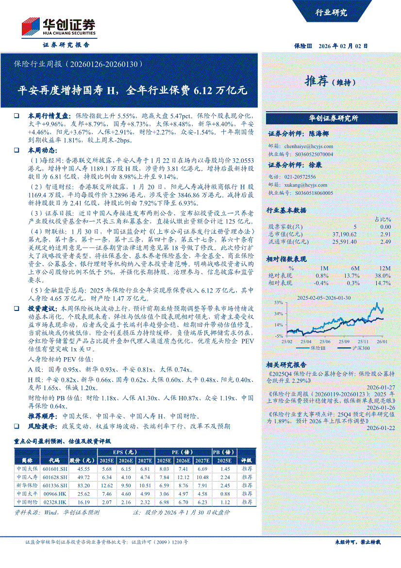 保险行业:华创证券-保险行业周报:平安再度增持国寿H,全年行业保费6.12万亿元-260202