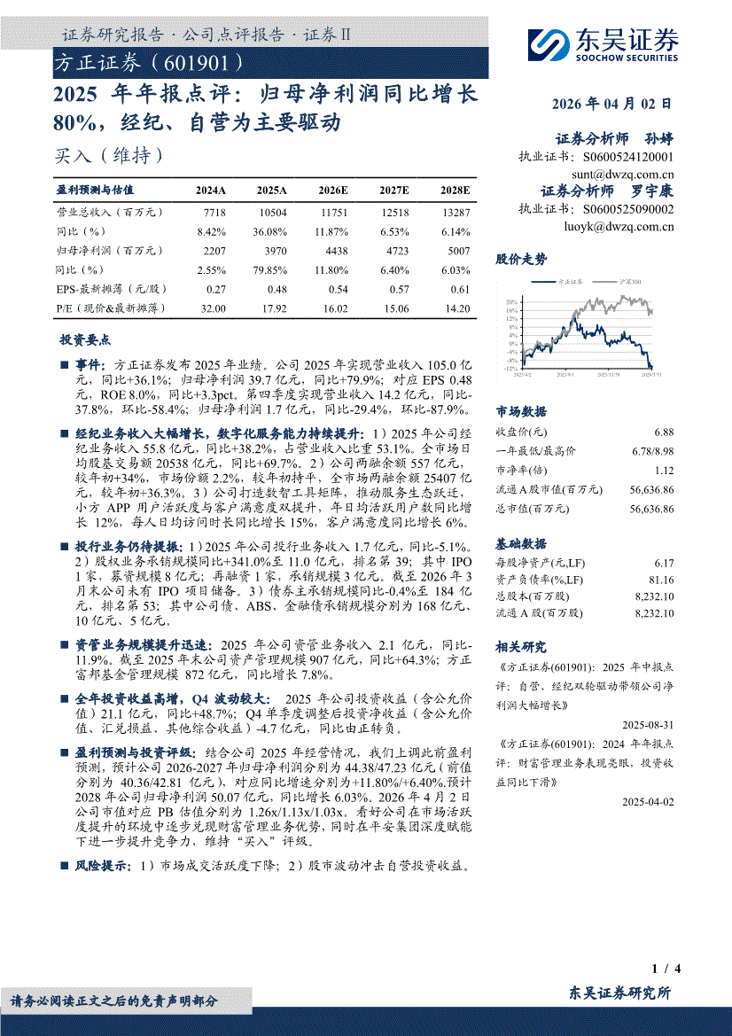 方正证券:东吴证券-方正证券-601901-2025年年报点评:归母净利润同比增长80%,经纪、自营为主要驱动-260402
