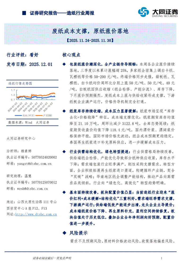大同证券-造纸行业周报:包装纸提价延续,特种纸增长可期-251124
