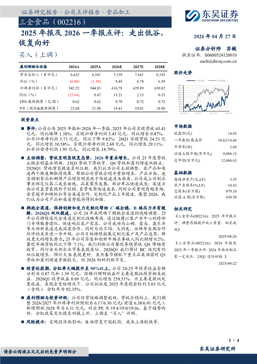 三全食品:东吴证券-三全食品-002216-2025年报及2026一季报点评:走出低谷,恢复向好-260427