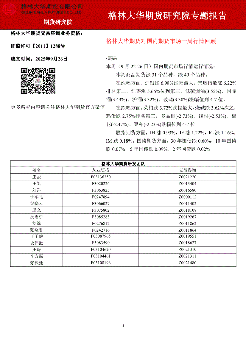 格林大华期货-对国内期货市场一周行情回顾-250926