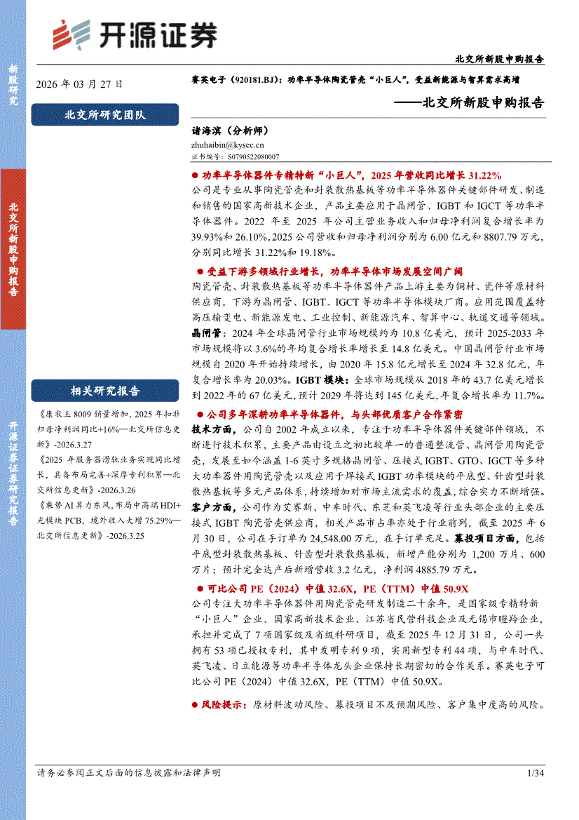 赛英电子:开源证券-赛英电子-920181-北交所新股申购报告:功率半导体陶瓷管壳“小巨人”,受益新能源与智算需求高增-260327