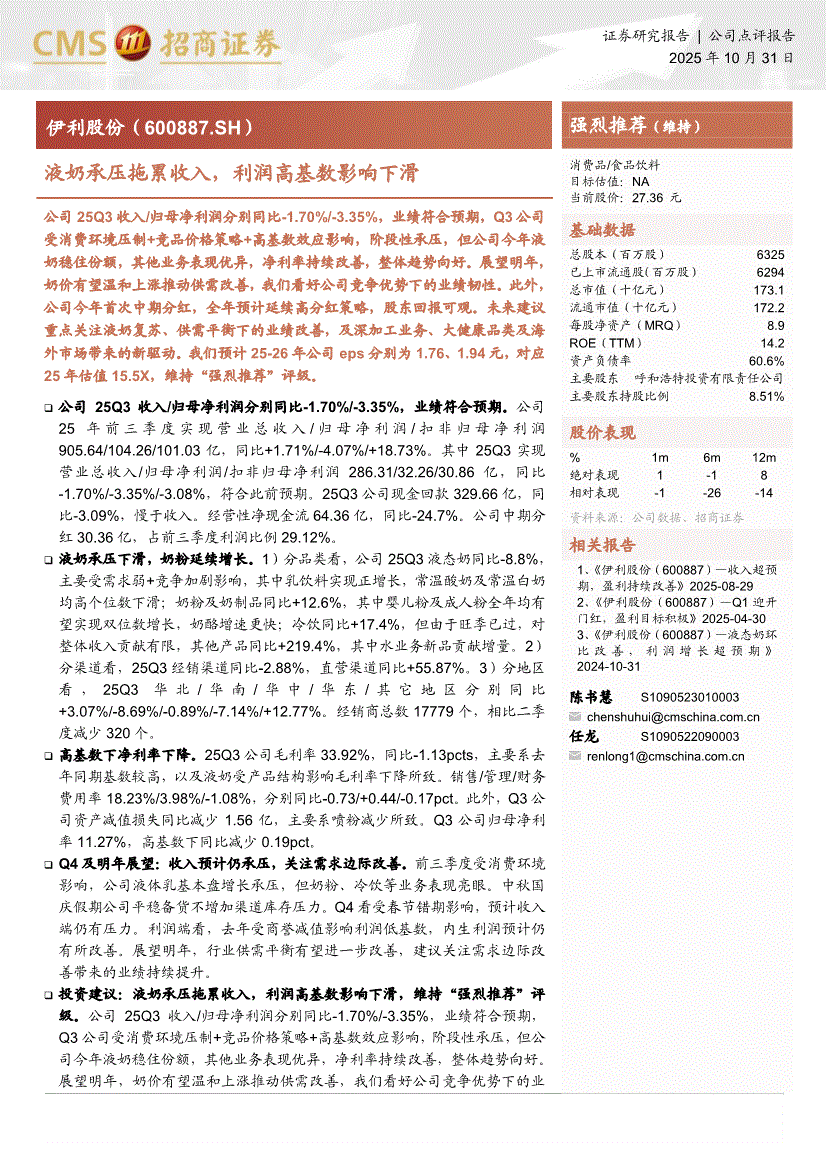 伊利股份:招商证券-伊利股份-600887-液奶承压拖累收入,利润高基数影响下滑-251031
