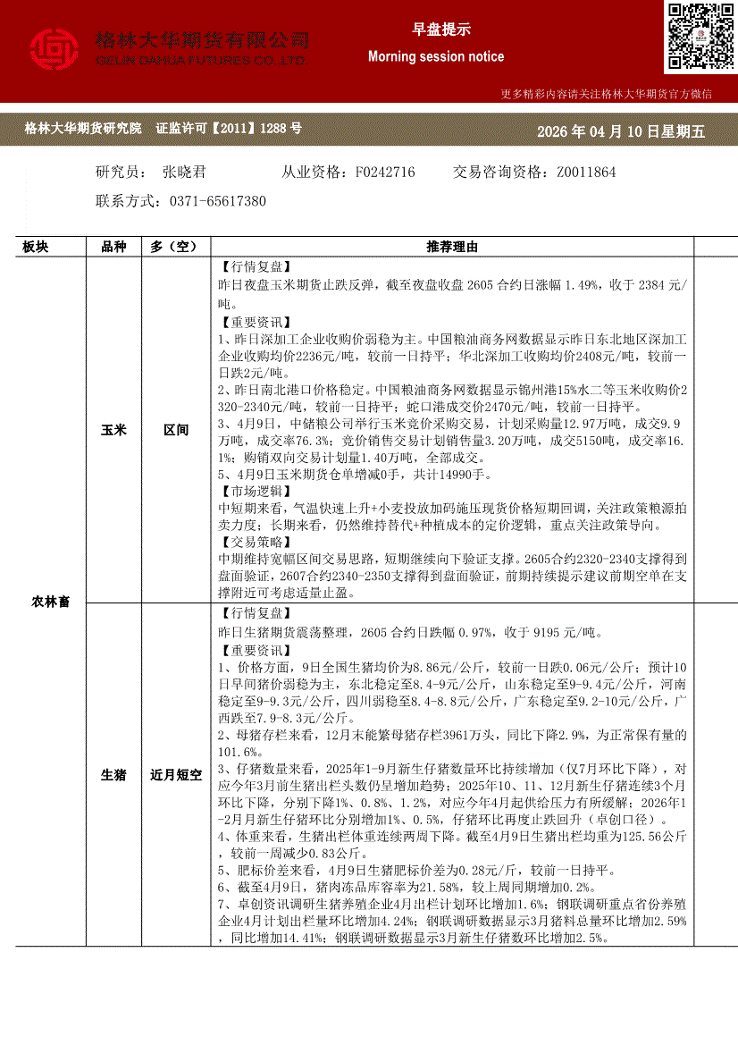格林大华期货-早盘提示:玉米生猪鸡蛋-260410