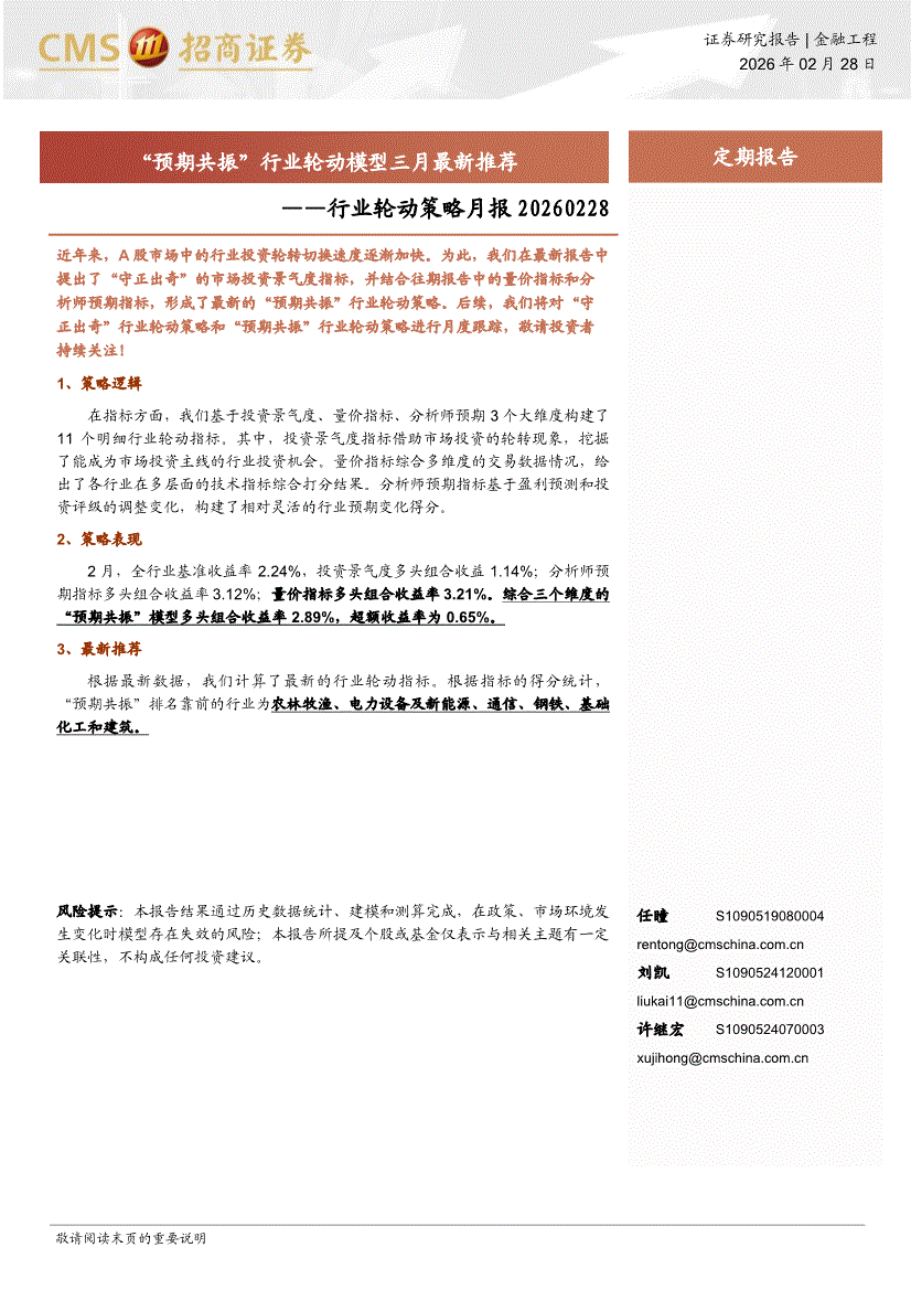 招商证券-行业轮动策略月报:“预期共振”行业轮动模型三月最新推荐-260228