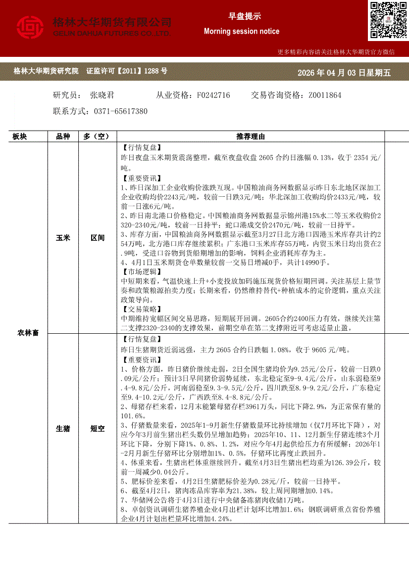 格林大华期货-早盘提示:玉米生猪鸡蛋-260403