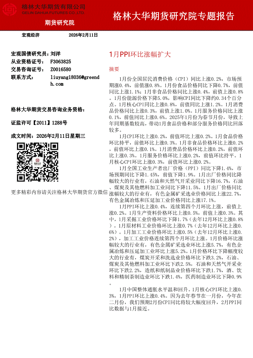 格林大华期货-1月PPI环比涨幅扩大-260211